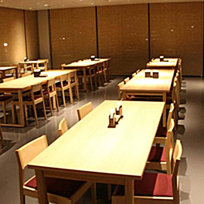 The lights only spot light the tables, which emphasizes the feeling of intimacy. It also gives enough light to the face of customers, which can the atmosphere warm increase the appetite.